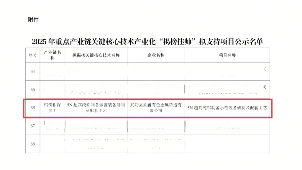 公開されたプロジェクトは、完全な独立した知的財産権を有する5Nグレード以上の超高純度アルミニウムの調製技術と実証設備一式を研究開発することを目的としており、年間生産量30トンの実証生産ラインを建設し、材料純度、製品サイズ、生産効率、エネルギー消費量、環境保護などの主要指標が国際的な先進レベルに達することを目標としている。