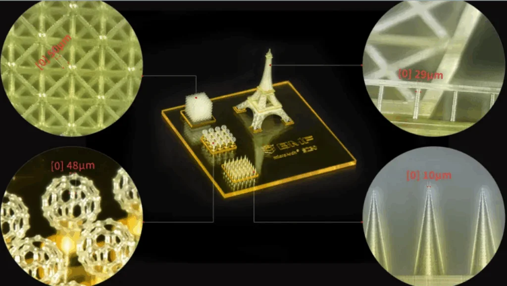 Mofang Precision confía en su tecnología de "microestereolitografía de proyección superficial" de desarrollo propio para lograr una impresión de detalles de alta precisión a 2 micras, con dimensiones de tolerancia en el rango de +-10 micras. Este avance tecnológico convierte a Mofang Precision en la única empresa del mundo que ofrece con éxito soluciones de fabricación aditiva de alta precisión.